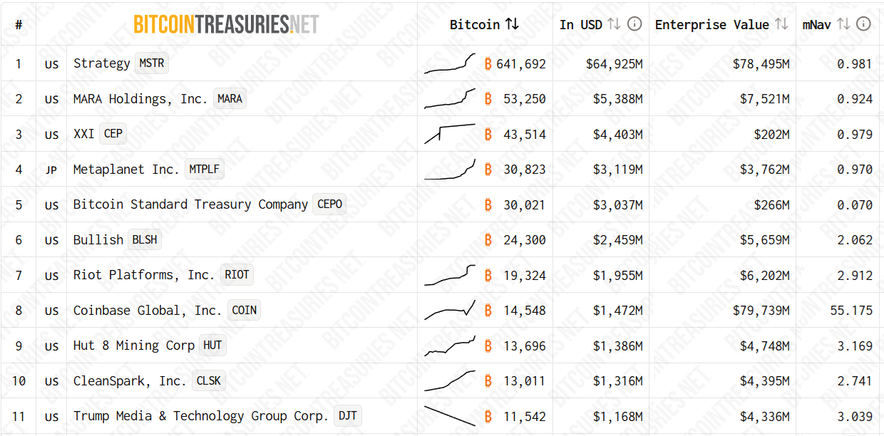 Bitcoin reserve strategy companies. Source: BitcoinTreasuries.Net