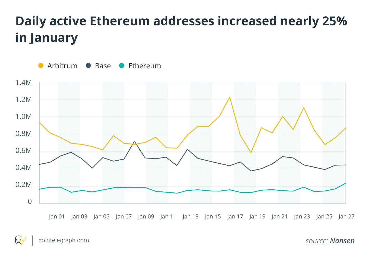 Activity on the Ethereum network has also seen a significant uptick. At the end of December, it overtook prominent L2s Base and Arbitrum in terms of daily active addresses. In January, the same metric increased 25%.