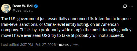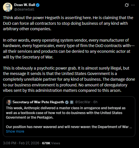 Perhaps the funniest response to all this was from Dean Ball, who went into the Trump administration to basically write Trump’s silly AI action plan. Over on X after Hegseth’s announcement, he had a bit of a meltdown about how much damage Hegseth was doing to the entire American AI industry.