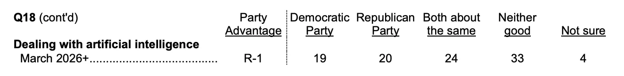 Just 26% of registered voters view AI positively, while 46% say they view it negatively, yielding a net favorability score of minus 20 points.