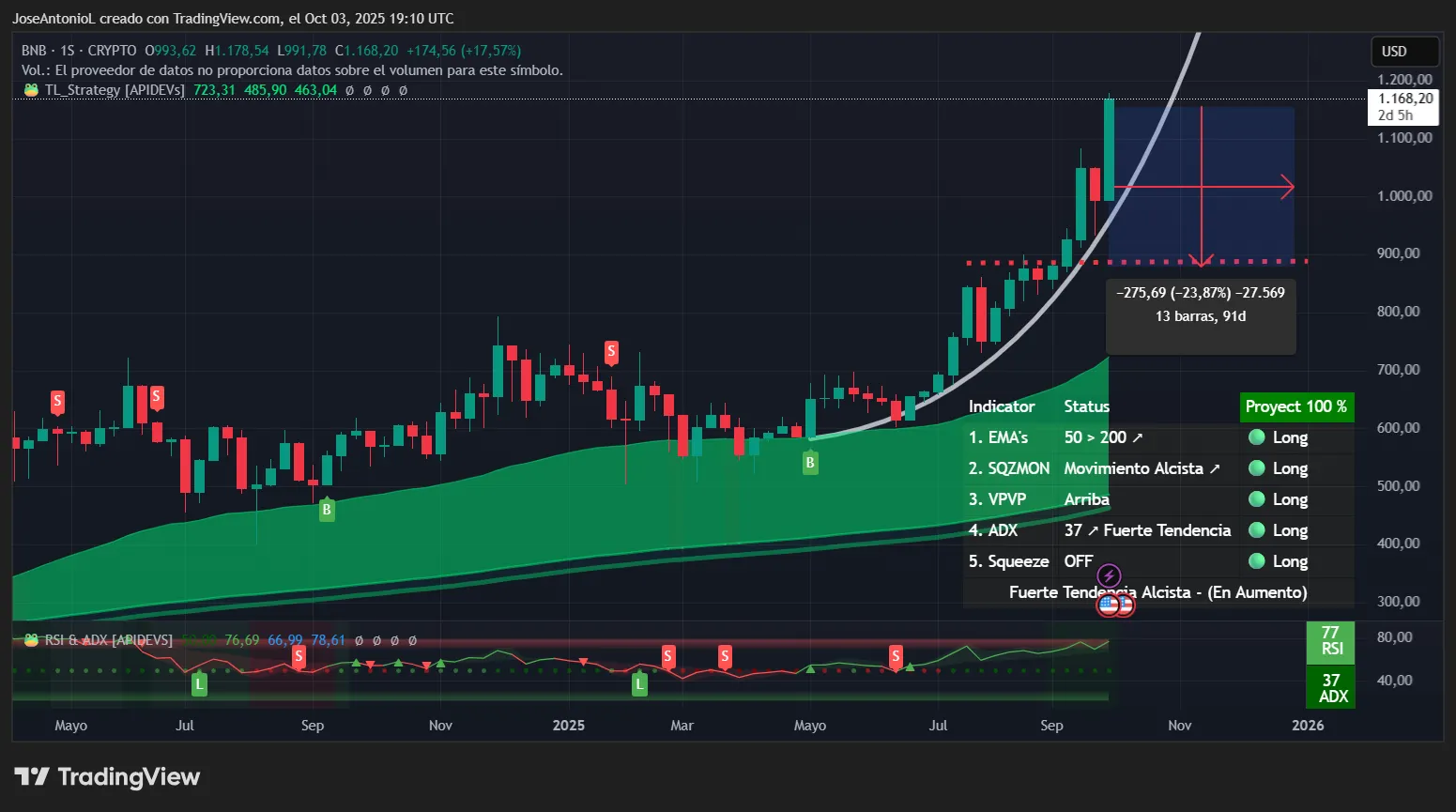 But here’s where things get interesting: BNB has been riding a powerful parabolic support line since mid-year. The chart shows a clear parabolic advance—the kind that can deliver explosive gains but also tends to end with equally explosive corrections. Looking at the projection, if this trajectory continues uninterrupted, BNB could be trading near $2,000 by December 31, potentially delivering another 67% gain from current levels over the next 89 days.
