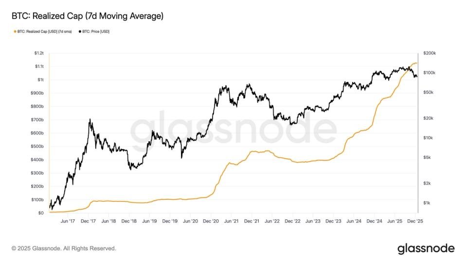 This on-chain metric, which values each bitcoin at the price it last moved, highlights actual capital inflows rather than speculative price action like total market capitalization.