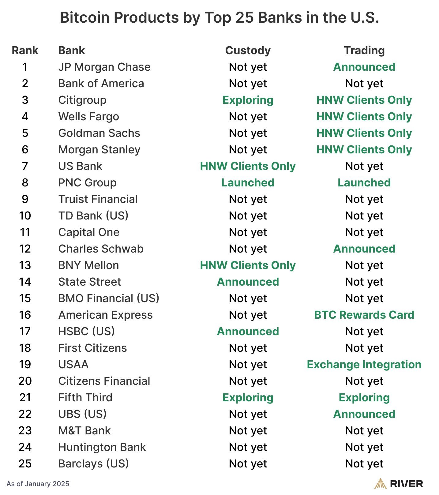 A large chunk of top banks are exploring Bitcoin-related services. Source: River