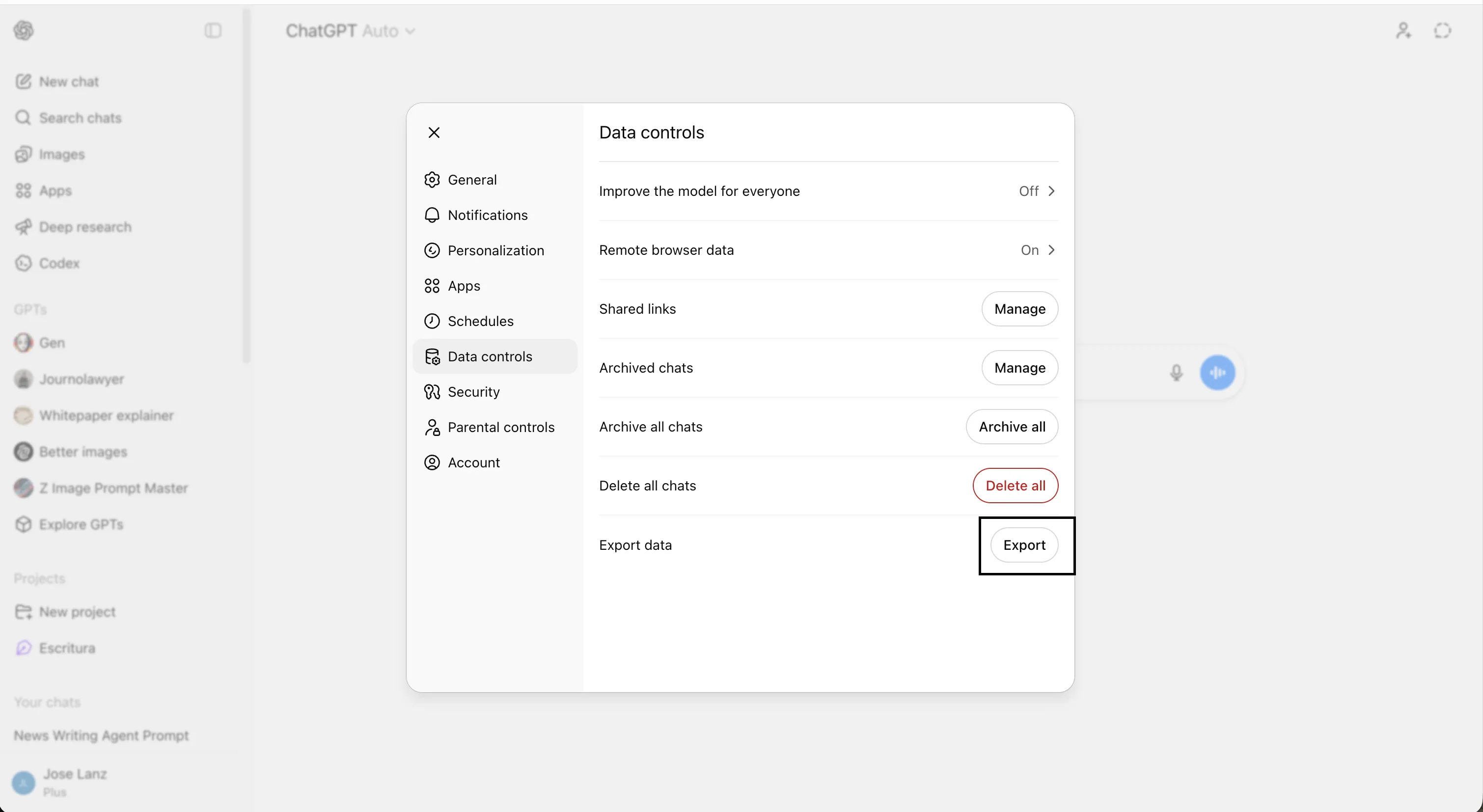 To export, go to ChatGPT, click your profile icon in the bottom-left corner, select Settings, then Data Controls, then Export Data. After that, hit Confirm Export. OpenAI will email you a download link within a few minutes. The link expires after 24 hours, so download immediately.