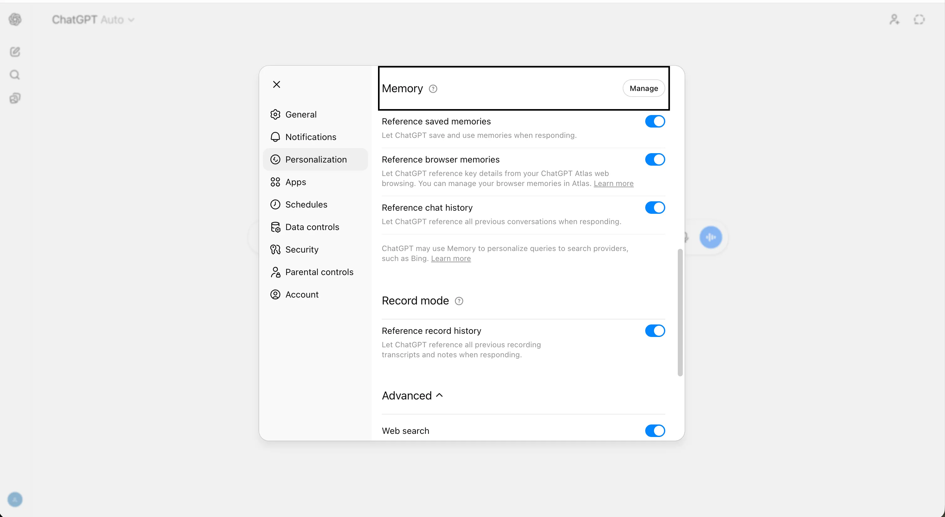 Before you delete anything, look at what it actually knows. Go to Settings → Personalization → Manage Memory (you have to scroll until you find the option). You will see a list of every saved memory entry. Read through it. For many long-term users, this list is a surprisingly intimate portrait: your job, your location, your writing voice, your dietary preferences, your recurring anxieties. Save a copy of this list manually—screenshot it or copy the text into a document—before deleting.