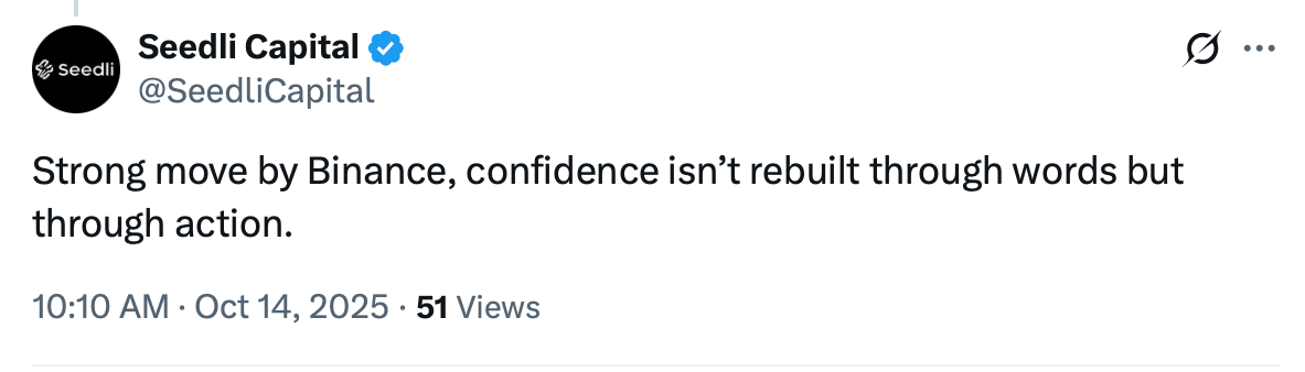 Binance’s Tuesday announcement has received mixed reactions on X. While some users, like SeedliCapital, praised the exchange for rebuilding “confidence” by taking action, others were less charitable.