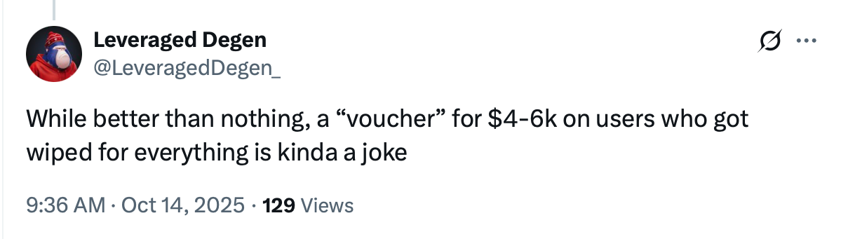 Others said the reimbursements were welcome but fell short of covering the weekend’s losses. “While better than nothing, a ‘voucher’ for $4 to $6k  on users who got wiped for everything is kinda a joke,” LeveragedDegen wrote.