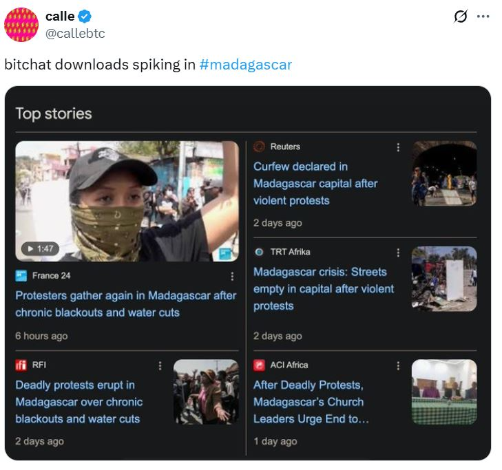 Home»Cryptocurrency & Free Speech Finance»Bitchat searches, downloads spike in Madagascar amid protests