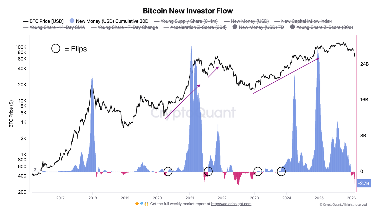 In prior cycles, including 2020, 2021 and 2022, sustained bullish reversals only emerged once new-investor flows flipped decisively back into positive territory.