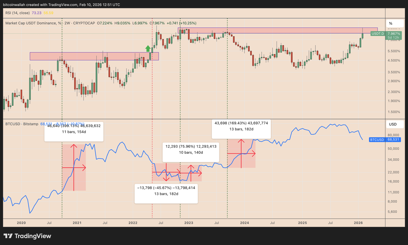 USDT dominance broke above that range in May 2022, and Bitcoin then fell by 45%, further reflecting the inverse correlation between the two.