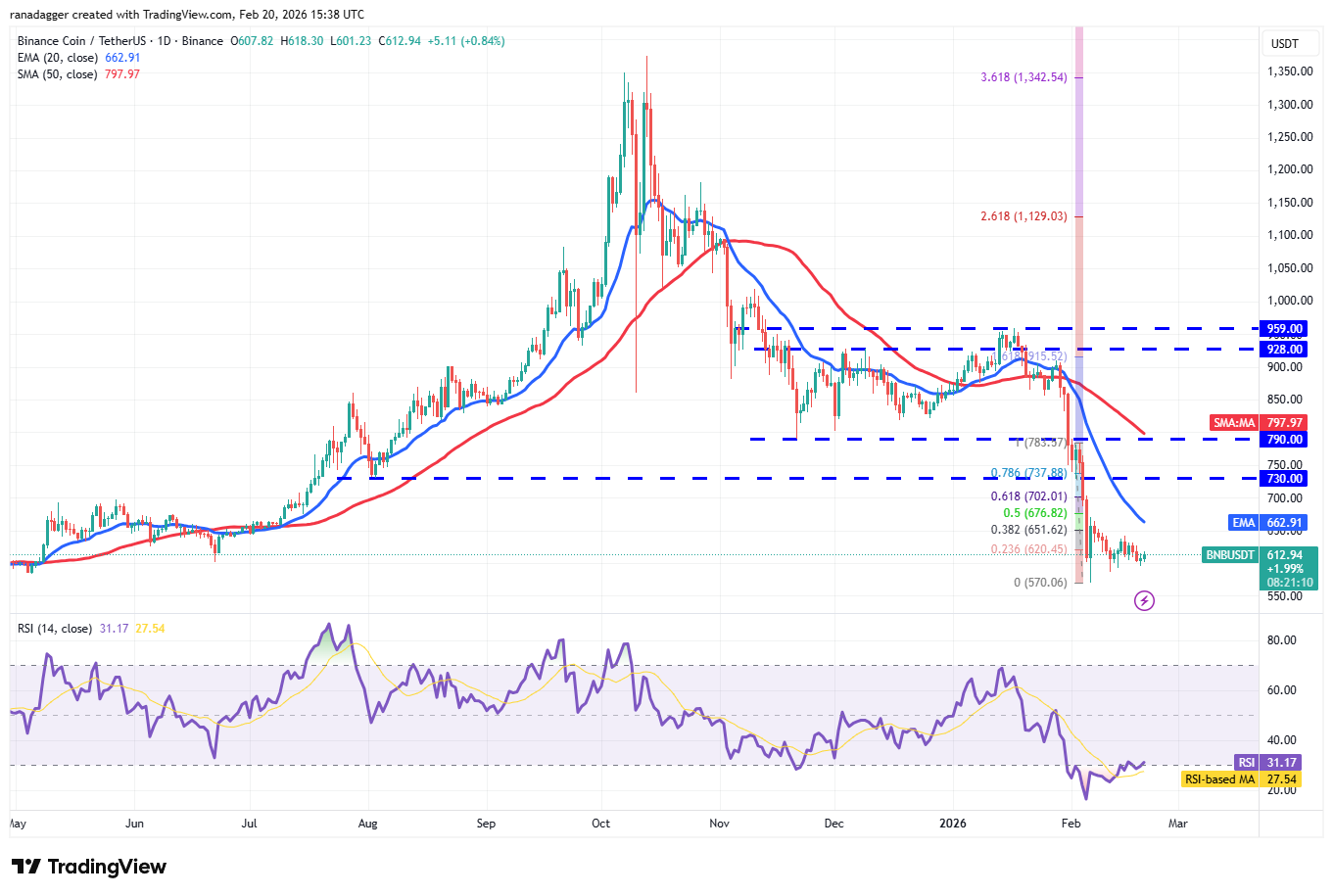 BNB (BNB) has been gradually sliding toward the $587 to $570 support zone, indicating that the bears are in control.