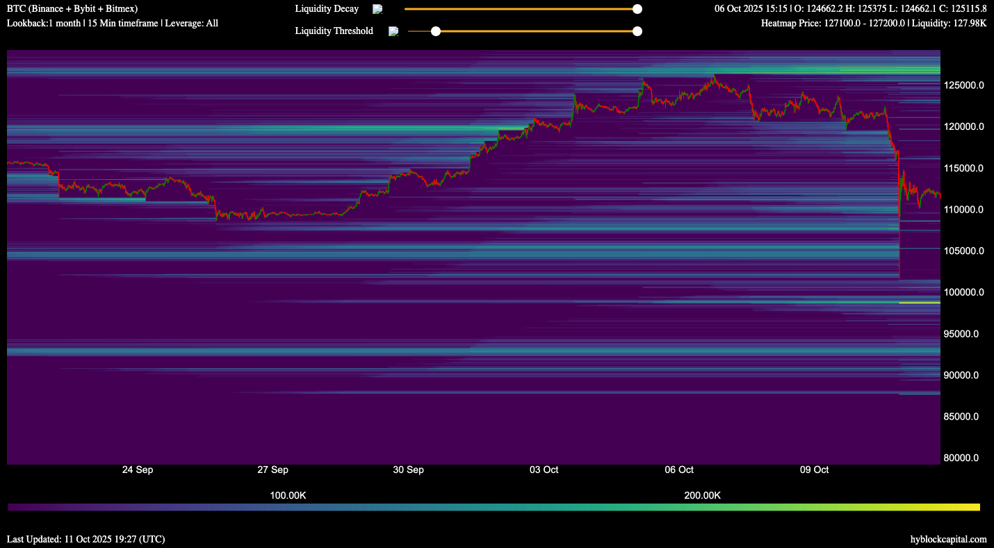 “If we look at liquidation heatmap data from Hyblock Capital, which basically shows where all the short and long positions are across various orderbooks at centralized crypto exchanges, we can see that there’s a liquidity pocket of long positions that are being exploited…that pocket extends from $120,000 to $115,000 and from $115,000 to $113,000.”