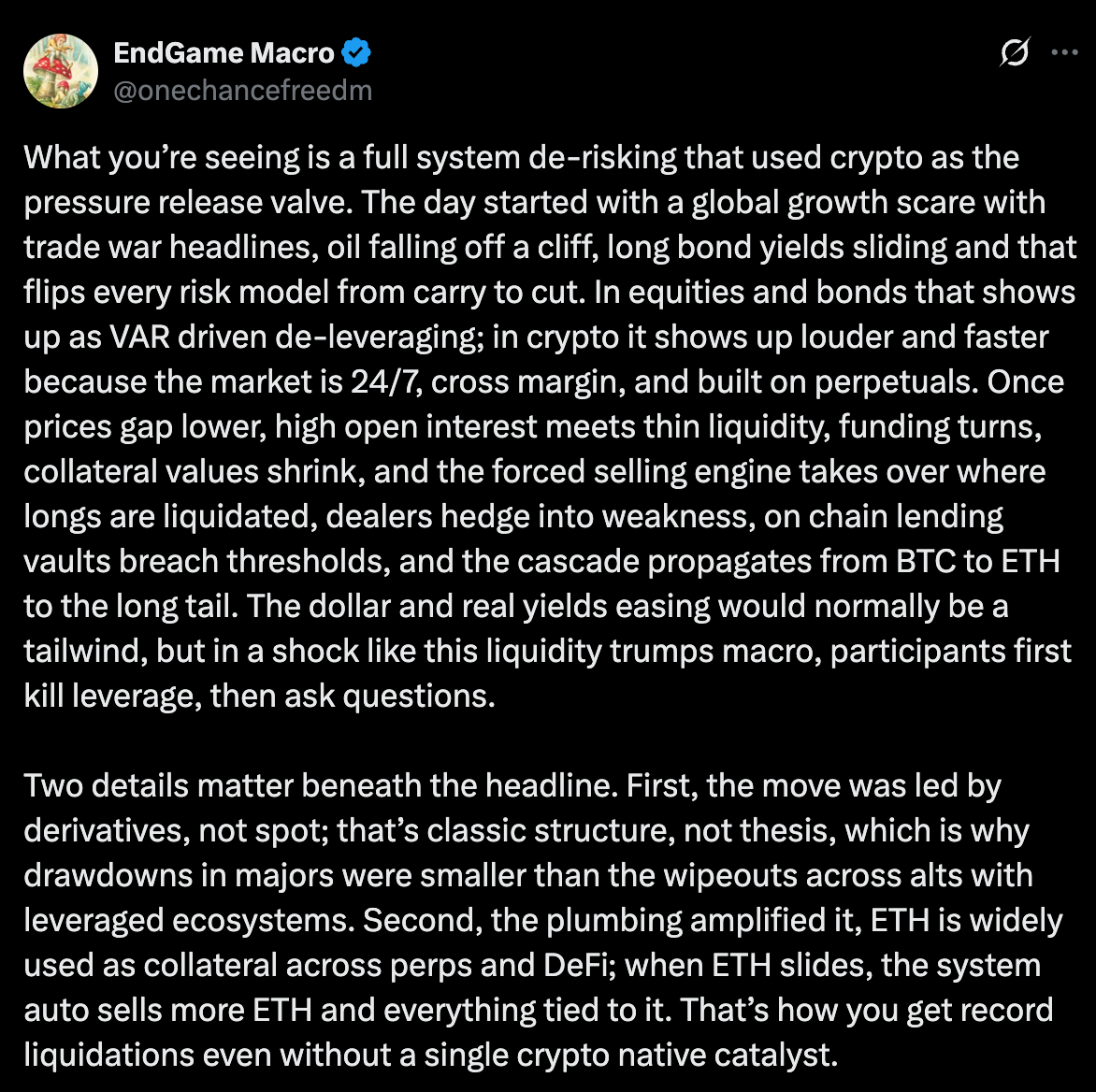 X user, EndGame Macro provided one of the best contextual overviews of what was happening in the background prior to the mayhem seen in crypto markets.
