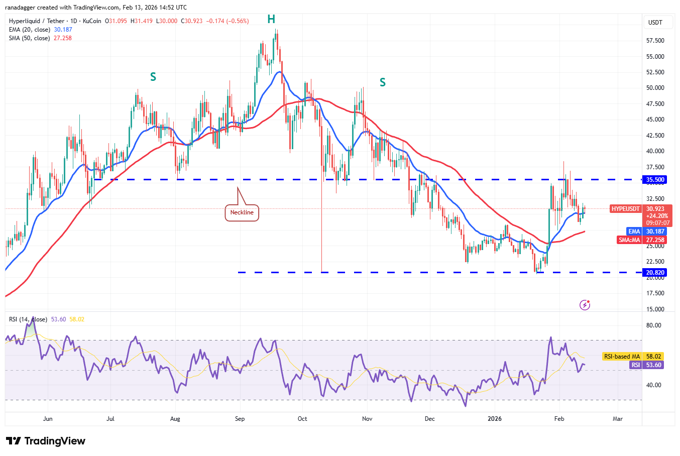 Hyperliquid (HYPE) has risen back above the 20-day EMA ($30.18) on Thursday, indicating buying on dips.
