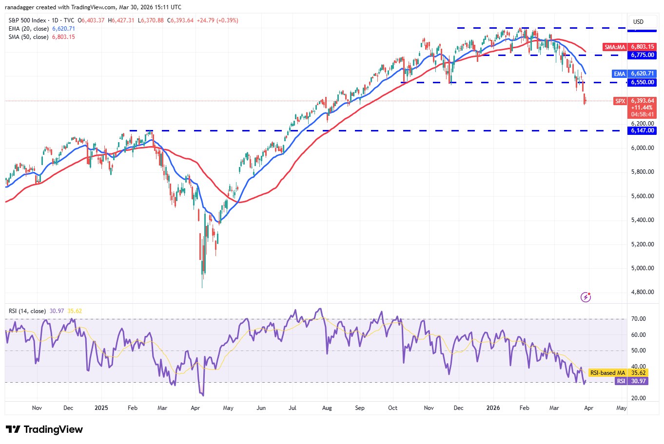 On the other hand, a break and close above the 20-day EMA suggests that the bears are losing their grip. The index may then rally to the 50-day simple moving average (6,803).