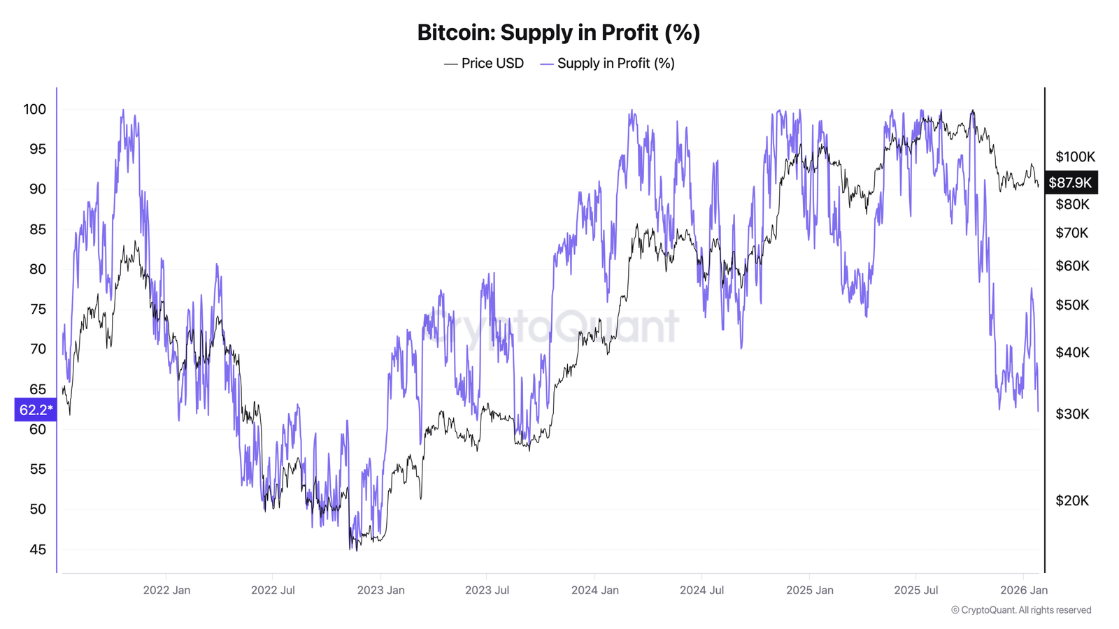 Supply in profit currently stands at 62% — the lowest level since September 2024, when Bitcoin traded at around $30,000.