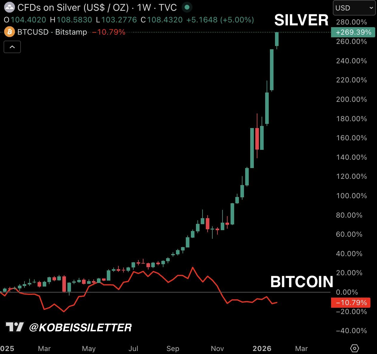 “Silver prices are now outperforming Bitcoin by one of their widest margins on record. In ~13 months, Silver is up +270% as Bitcoin has fallen -11%. This makes Silver’s market cap 3.5 TIMES larger than Bitcoin. The world is waiting on crypto.”