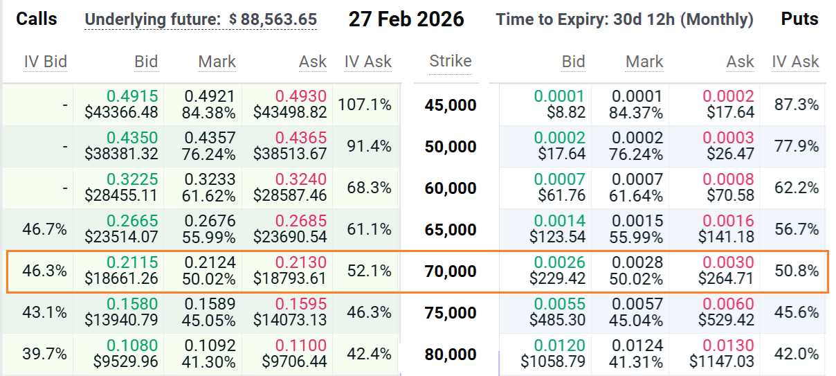 For example, a $70,000 BTC call option for Feb. 27 currently trades at 0.212 BTC, which is significantly higher than an $80,000 call option at 0.109 BTC. This price gap explains why bulls typically prefer options near or slightly above the spot price level. Conversely, BTC call options at $110,000 or higher are often disregarded, as their cost is lower than 0.002 BTC (roughly $180).