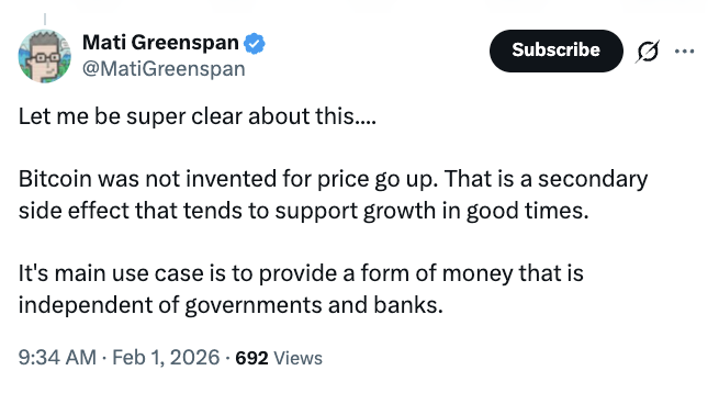 Quantum Economics CEO Mati Greenspan said Bitcoin was not designed to rise in price, calling that a secondary effect rather than its core purpose.