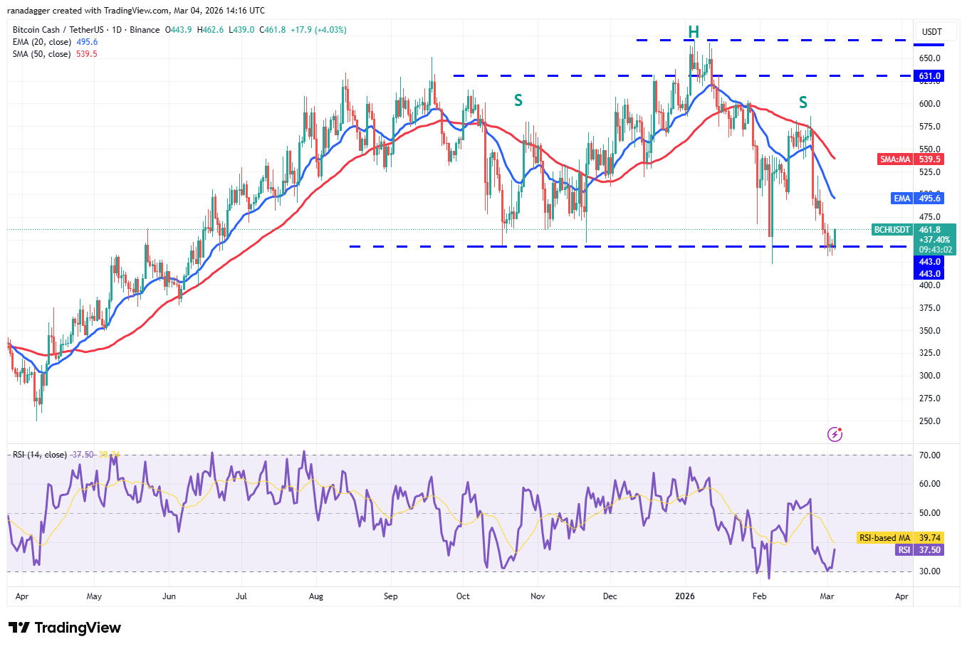 The bulls are attempting to start a relief rally, which is likely to face selling at the 20-day EMA ($495). If the Bitcoin Cash price turns down sharply from the 20-day EMA, it increases the risk of a break below the $443 support. If that happens, the BCH/USDT pair will complete a bearish head-and-shoulders pattern, starting a downward move to $375.