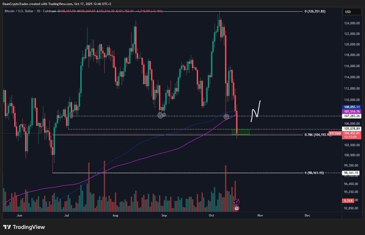 The price is “now testing the 0.786 fibonacci retracement level around $104,000,” analyst Daan Crypto Trades said in an X post on Friday, adding that losing this level would bring June lows at $98,000 into the picture.
