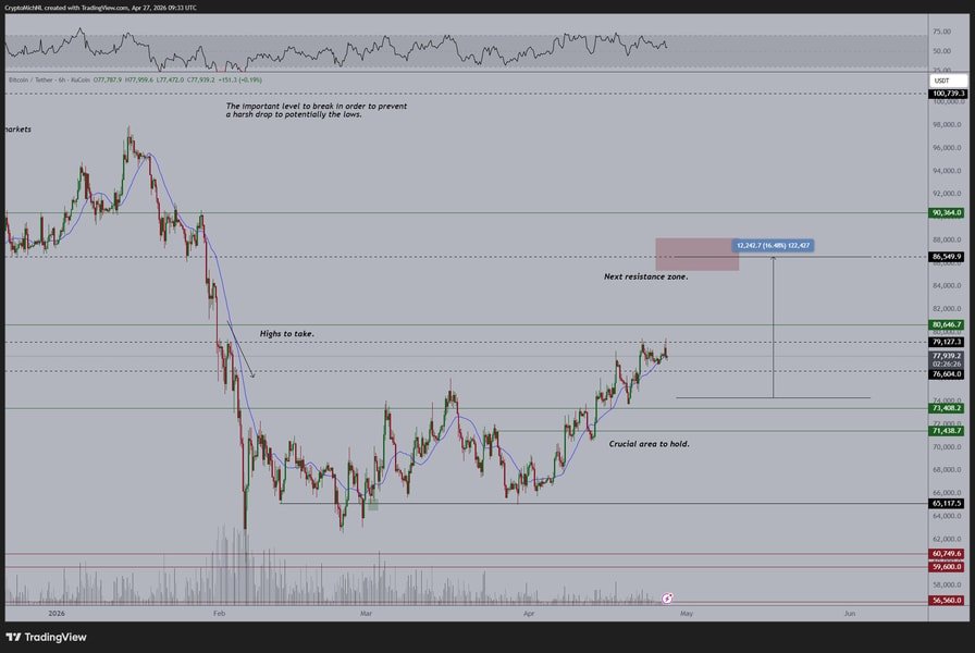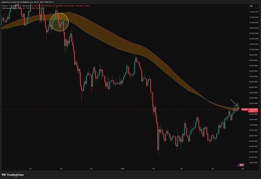 “While 80k is acting as a resistance right now, if we flip the band to support, it would point to a major macro-bullish shift.”