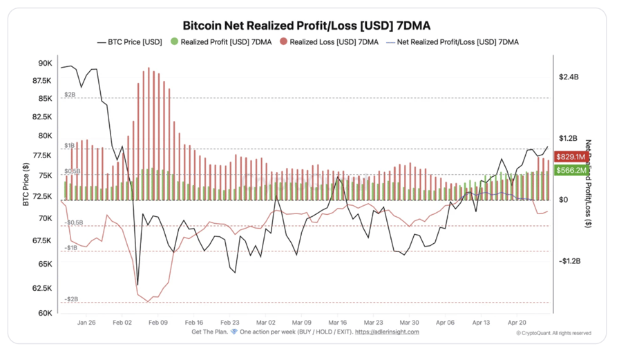 Onchain data adds to this view. Crypto analyst Darkfost noted that the weekly realized losses reached $829 million on a seven-day average, compared to $566 million in realized profits. The net realized profit briefly turned positive on April 9, then reversed within two weeks.