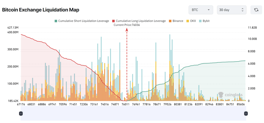 With the support level established at $75,000, the derivatives data outlines a tight liquidity corridor. Cumulative long liquidation risk nears $74,000, with roughly $2.69 billion at risk, while short liquidations near $80,000 total about $4.48 billion.
