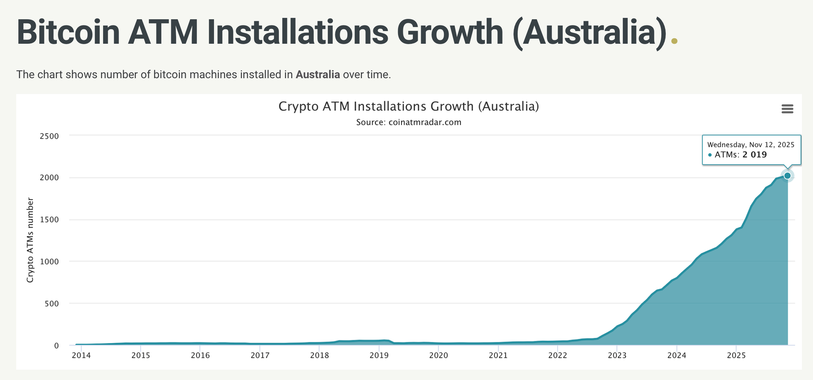 The United States leads with 30,869 Bitcoin kiosks, but growth has been faster elsewhere. Australia, for instance, has surged from just 21 machines in 2021 to 2,019 today, becoming the third-largest hub for Bitcoin ATMs, behind the US and Canada.