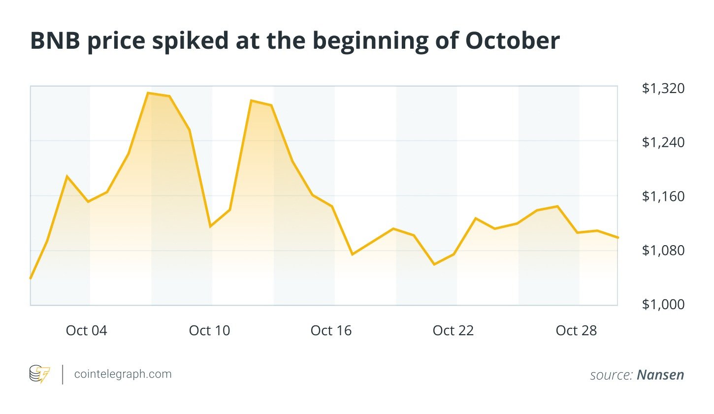 The memecoin frenzy saw a concomitant spike in BNB’s (BNB) token price, which broke $1,300 on Oct. 13. The token has since fallen but still remains up 6.6% on the month.