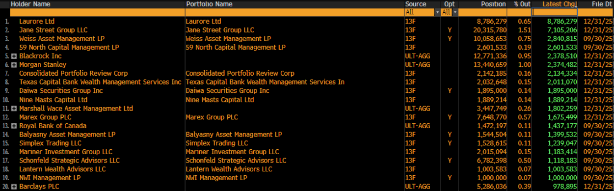 Beyond Laurore and Jane Street, several institutions made significant moves with IBIT in Q4 2025. Weiss Asset Management reportedly added roughly 2.8 million shares ($107.5 million), while 59 North Capital increased its position by 2.6 million shares ($99.8 million).