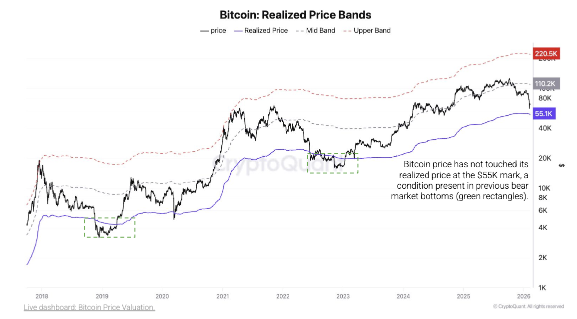 Crypto analytics platform CryptoQuant reiterated that realized price support remains at around $55,000 and has not yet been tested.