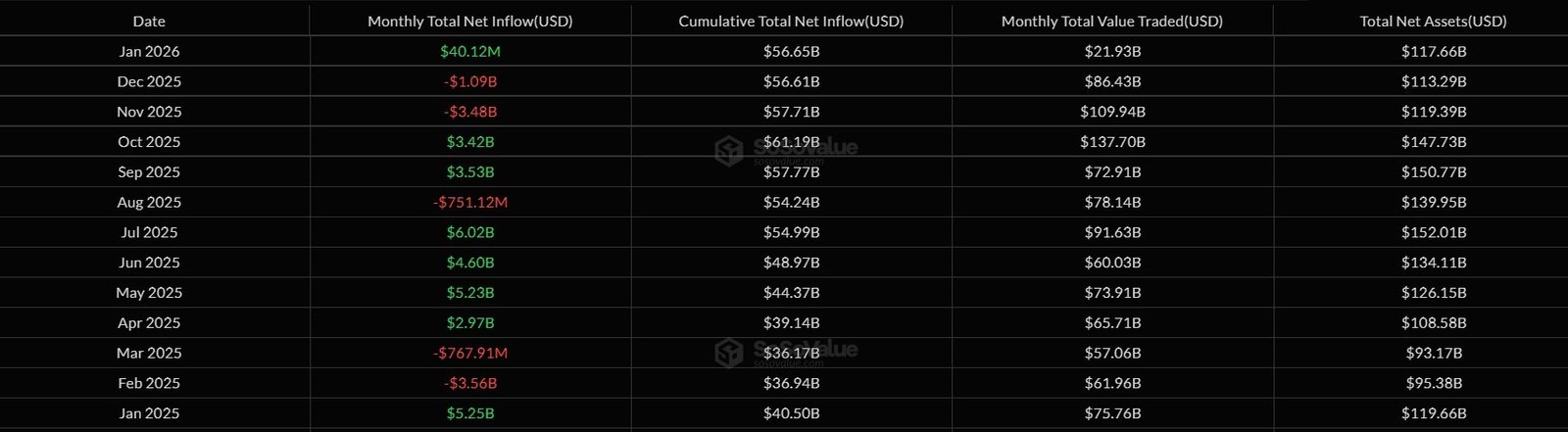 Spot ETFs tracking altcoins like XRP (XRP) and Solana (SOL) posted smaller monthly inflows but avoided outflow months. While inflow figures were significantly smaller, they consistently posted inflows amid broader volatility from the major funds.