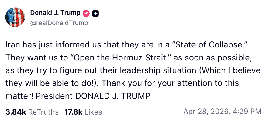 “Iran has just informed us that they are in a ‘State of Collapse,’” he wrote in a post on Truth Social.