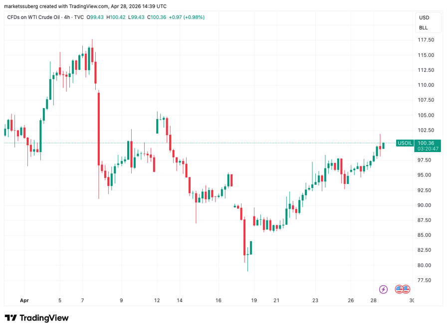 WTI crude oil returned to $100 per barrel on the day, as US President Donald Trump continued to keep markets guessing on the outcome of the Hormuz impasse.