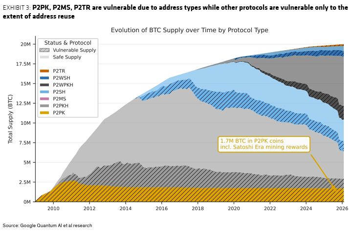 The risk is particularly pronounced for older “legacy” wallets. Roughly 1.7 million Bitcoin, including an estimated 1.1 million BTC attributed to Satoshi Nakamoto, are held in early P2PK addresses, where public keys are permanently exposed.