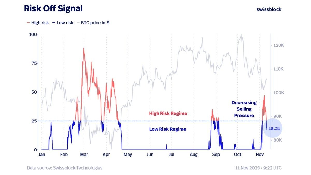 “The Risk-Off Signal has shifted back to a low-risk regime, showing that selling pressure is easing as Bitcoin recovers,” private wealth manager Swissblock said in its latest BTC analysis, adding: