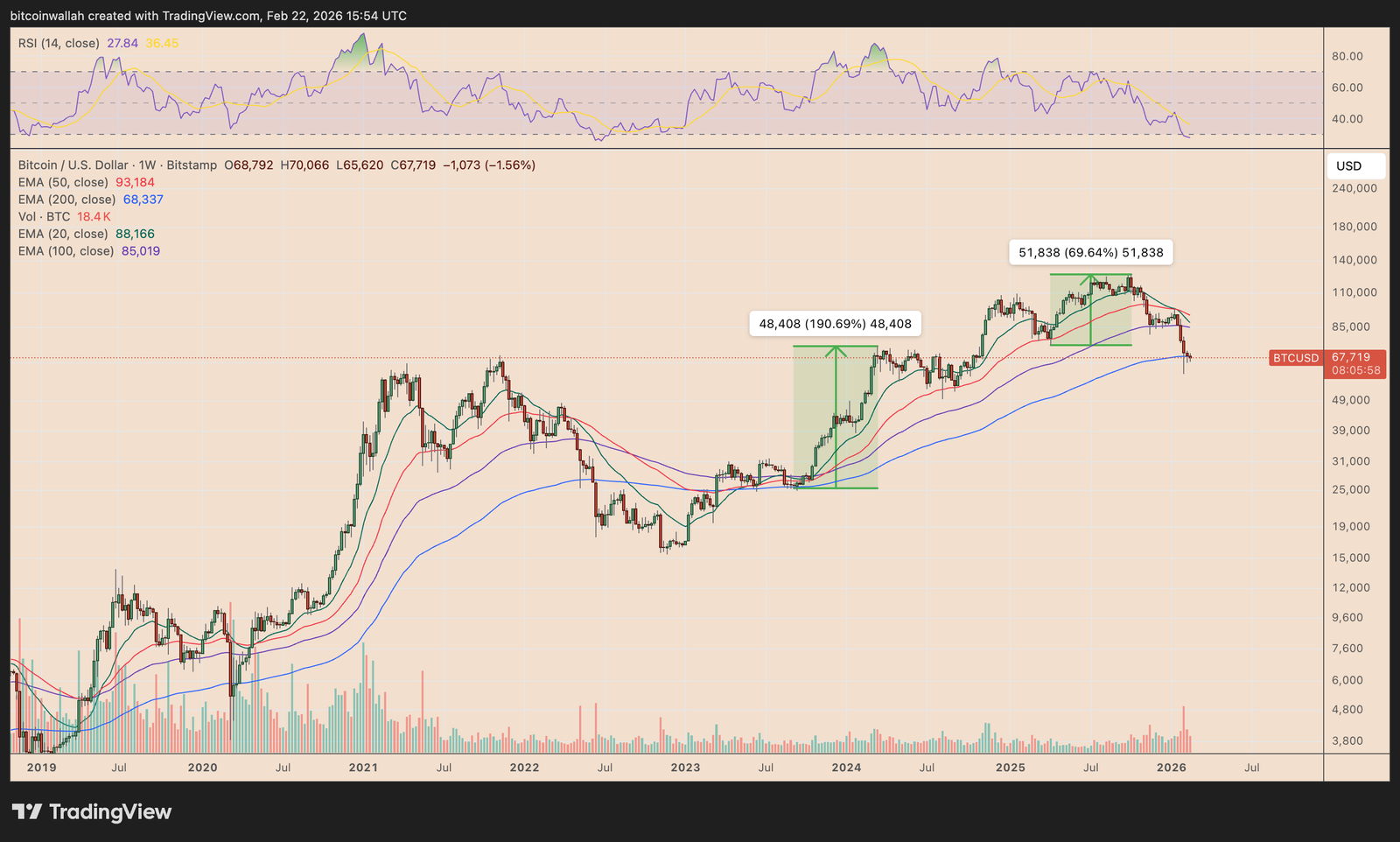As of February, the smart money swing is flashing once again, just as Bitcoin defends its 200-week exponential moving average (200-week EMA, the blue line), which has acted as a bear-market floor in most major drawdowns of the last decade.
