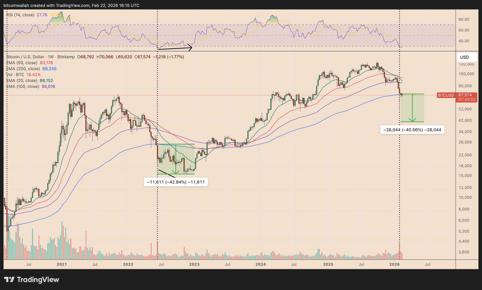 A repeat of that 40% plunge in 2026 could result in BTC prices falling toward $40,000, or 60% from its record high of around $126,270.