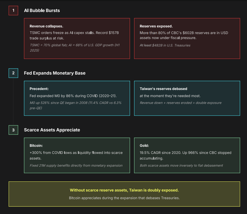 “Uniquely for Taiwan, Bitcoin provides geopolitical resilience: in a PRC blockade or invasion, gold is stranded or seized and USD reserves face potential restrictions, but Bitcoin remains fully accessible without physical transport,” he added.