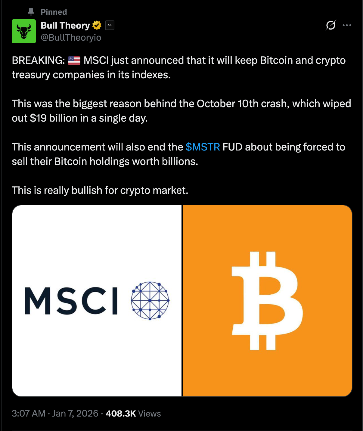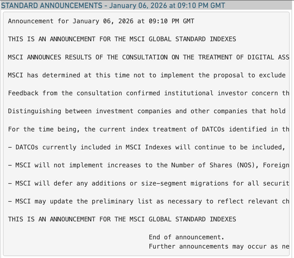 Previously, when companies like Strategy issued new equity to raise capital for Bitcoin purchases, passive funds tracking MSCI indexes were required to buy a portion of those shares, creating steady demand.