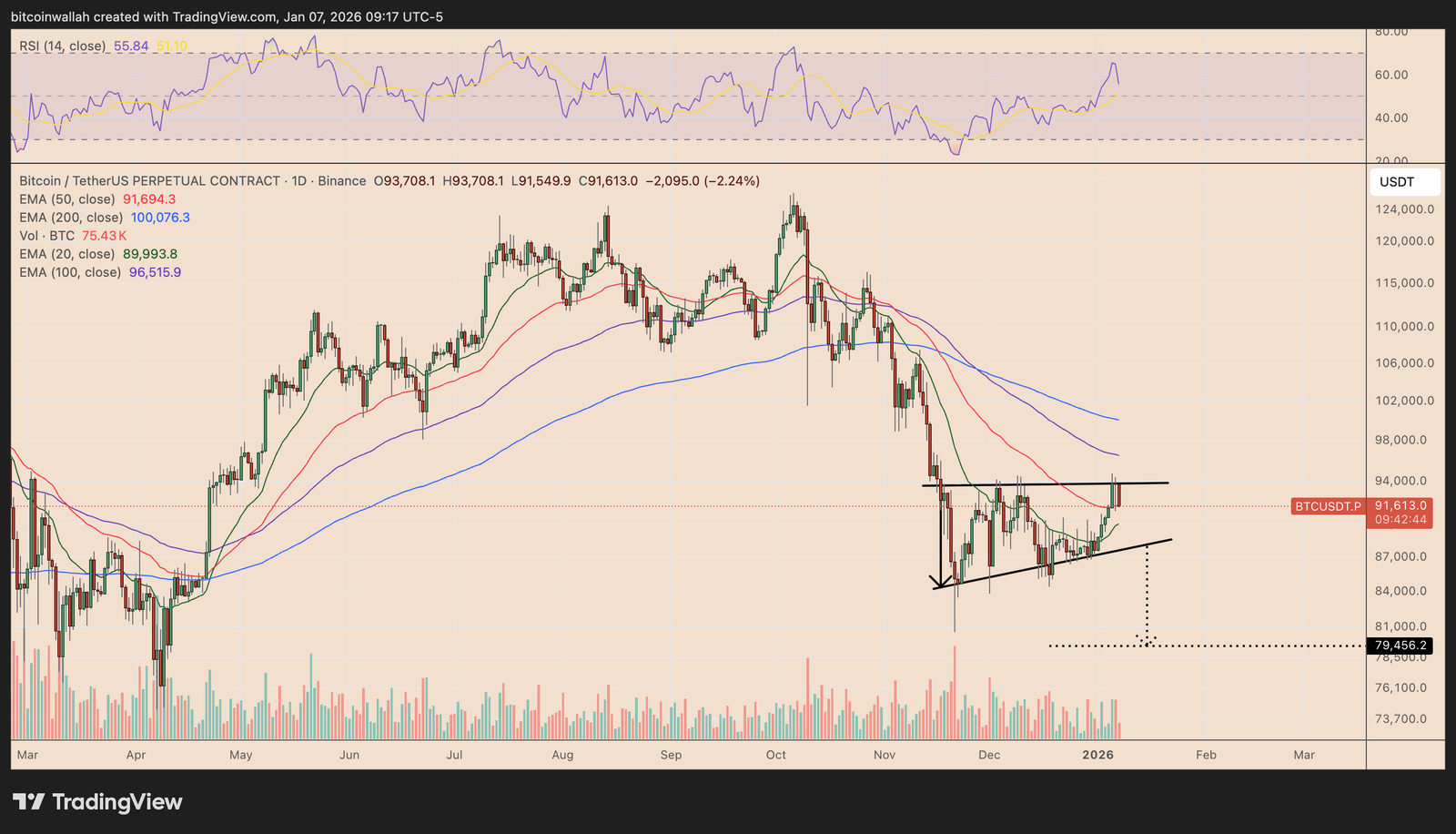 However, failure to sustain momentum above this level could expose downside risk toward the $88,000–$89,000 zone in January, aligning with the 20-day EMA (the green wave) and the triangle’s lower trendline.