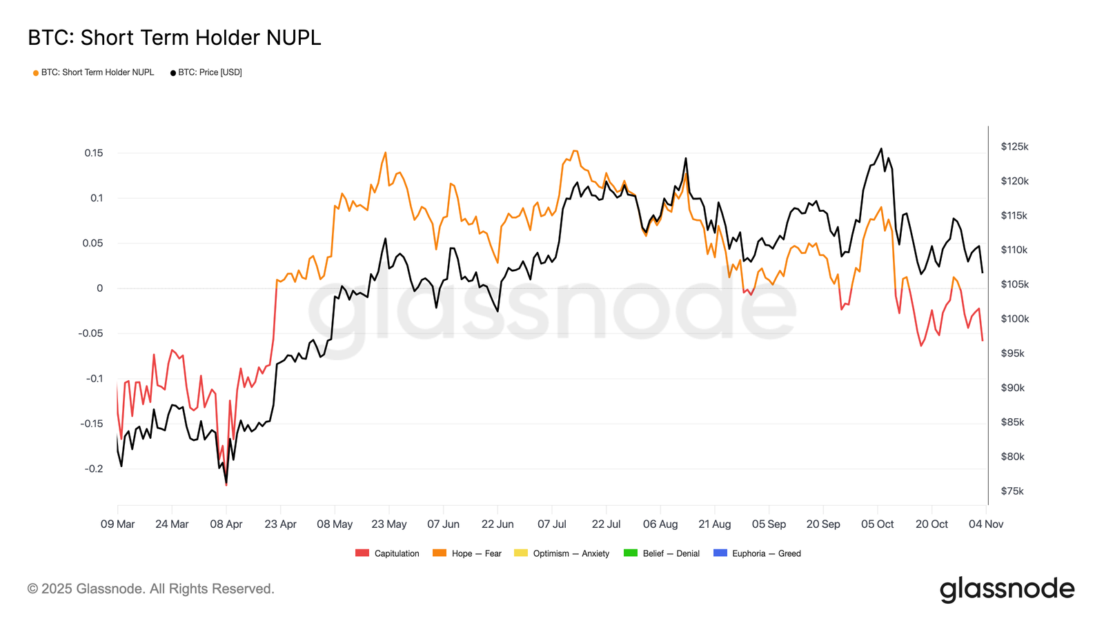 Data from onchain analytics platform Glassnode showed the Net Unrealized Profit/Loss (NUPL) indicator for short-term holders (STHs) returning to “capitulation” territory.