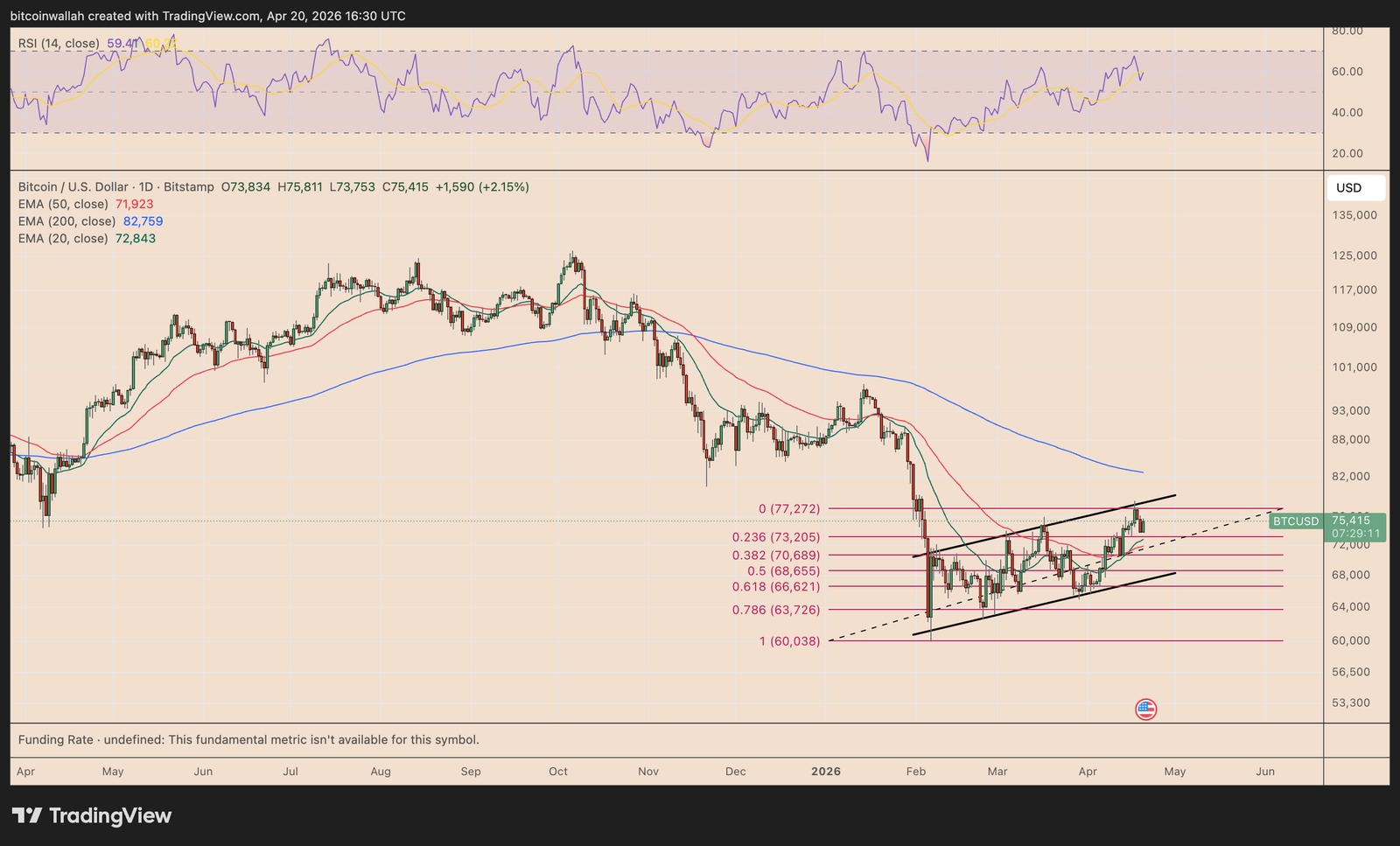 Bitcoin’s current chart structure shows classic flag consolidation, with price now drifting toward the pattern’s lower boundary. This setup raises the risk of a pullback toward the $67,000–$69,000 region in April, if support gives way.