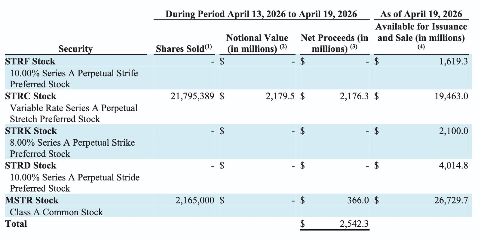 Strategy funded most of its latest 34,164 BTC purchase through its preferred stock, Stretch (STRC), which generated over $2.17 billion through at-the-market share sales between April 13 and April 19.
