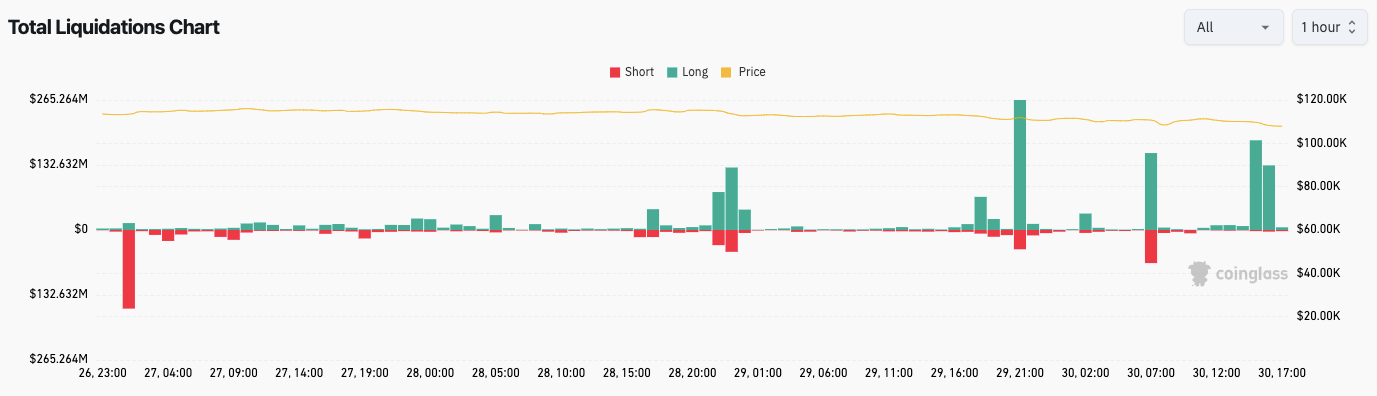 High liquidations characterized Crypto’s struggle as traders’ macro bets unraveled. Data from monitoring resource CoinGlass indicates that 24-hour liquidations reached over $1.1 billion at the time of writing.