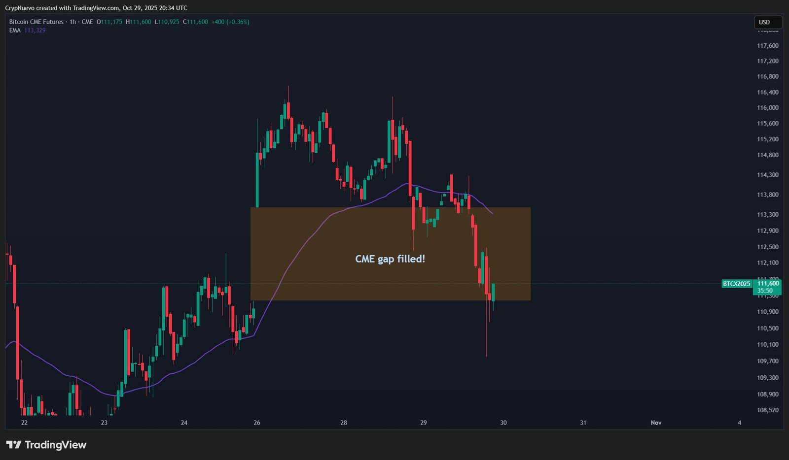 CrypNuevo noted that price had filled its latest weekend “gap” in CME Group’s Bitcoin futures market.