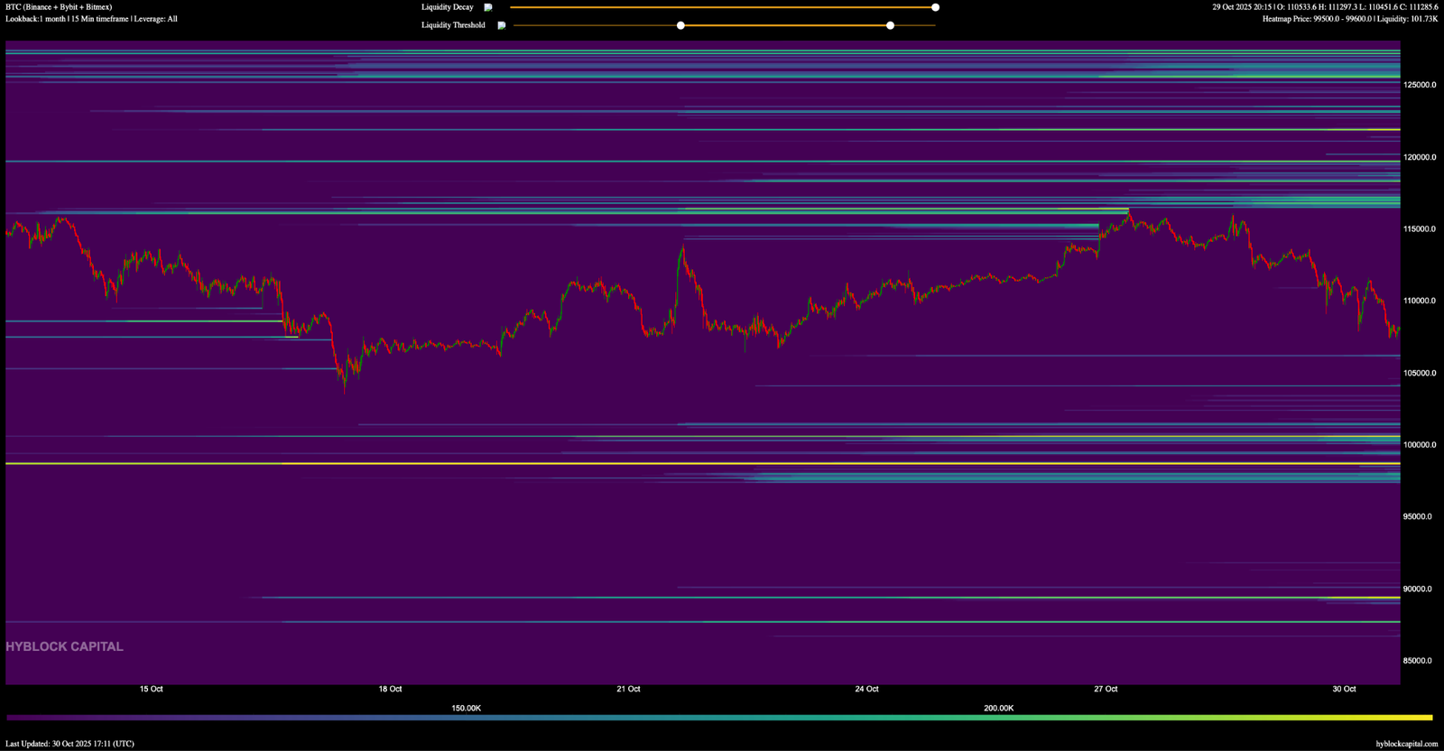 The 1-month lookback, which includes longer-held positions, shows long liquidity at $100,500 and $98,600.