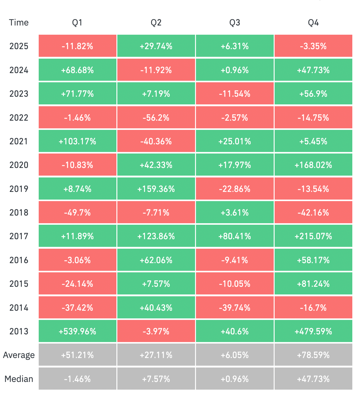 Looking at recent years, Bitcoin rallied by about 57% in Q4 2023 and 48% in Q4 2024. The rally was more exponential in 2017 with gains of 480% between Oct. 1 and Dec. 1.