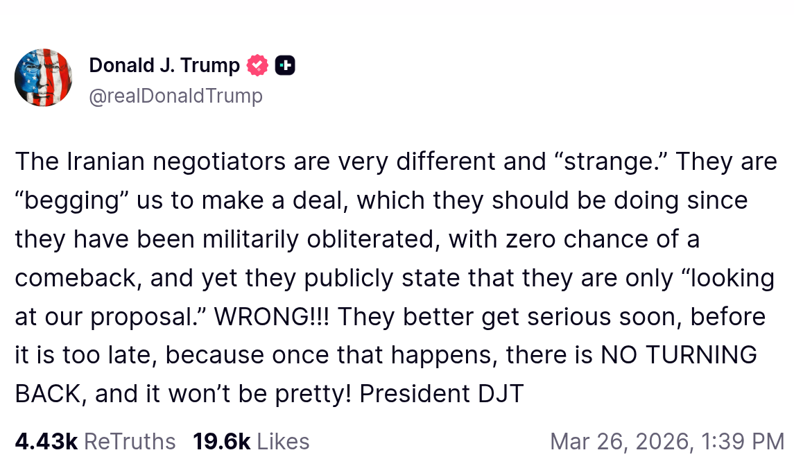 In a post on Truth Social, Trump called Iranian negotiators “very different and ‘strange.’”